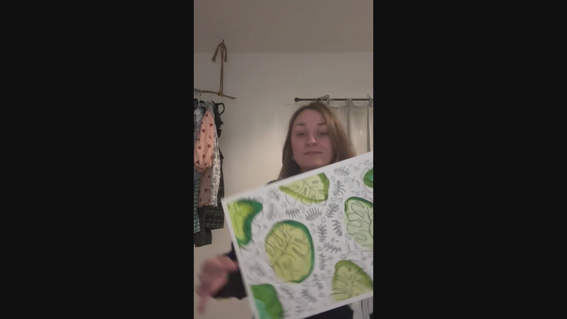 A detailed, intricate drawing with energetic splashes of watercolour. It has a good balance of calm and vibrancy, filled with monstera leaves, acorns, dandelion, fern and oak leaves. This would be perfect in any room in the house or as a gift.